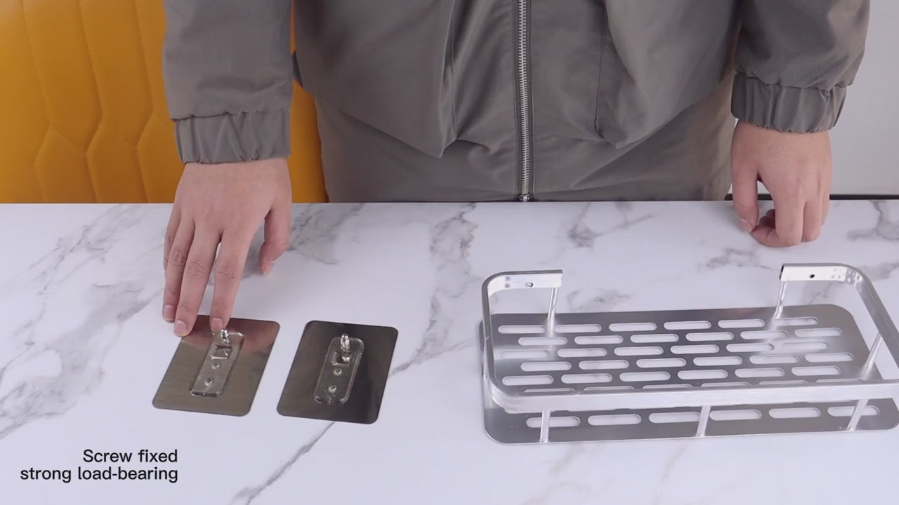 Excellent shelf for the bathroom. Installation is simple: on the wall install adhesive stickers, then unscrew the locks (silver, they are on the stickers), install the shelf, lock them on the wall. It's all set. Installed quickly. Keeps in the shower tightly, immediately put all the shower jars, nothing sagging, does not creak, does not hang out. All tight. I recommend to buy a shelf from this store.
