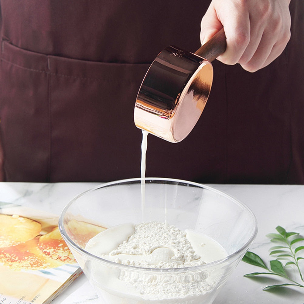 Collection of copper plated measuring cups and spoon, with a walnut handle. Stainless steel allows for easy use and clean - a classy addition to any kitchen.