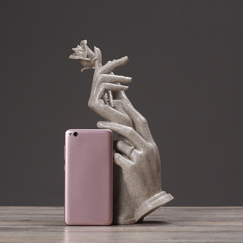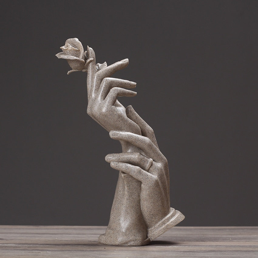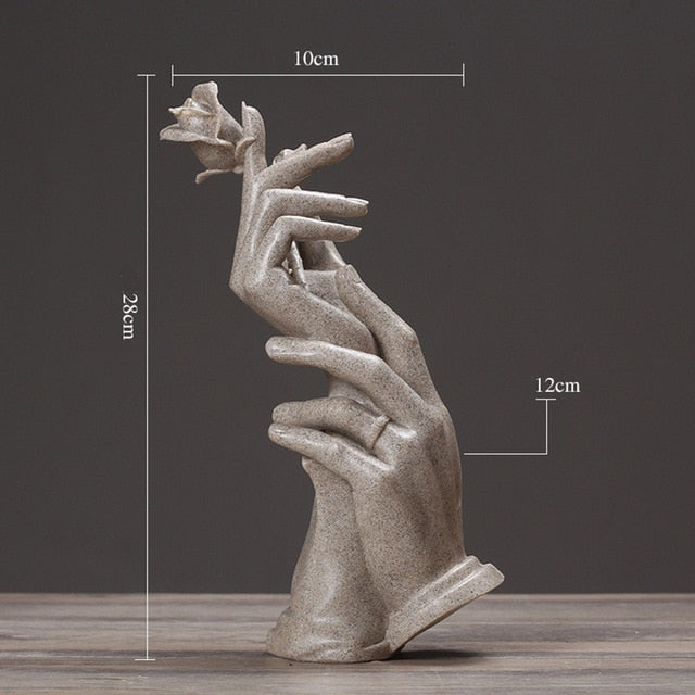 • Resin sculpture of embracing hands holding a rose
